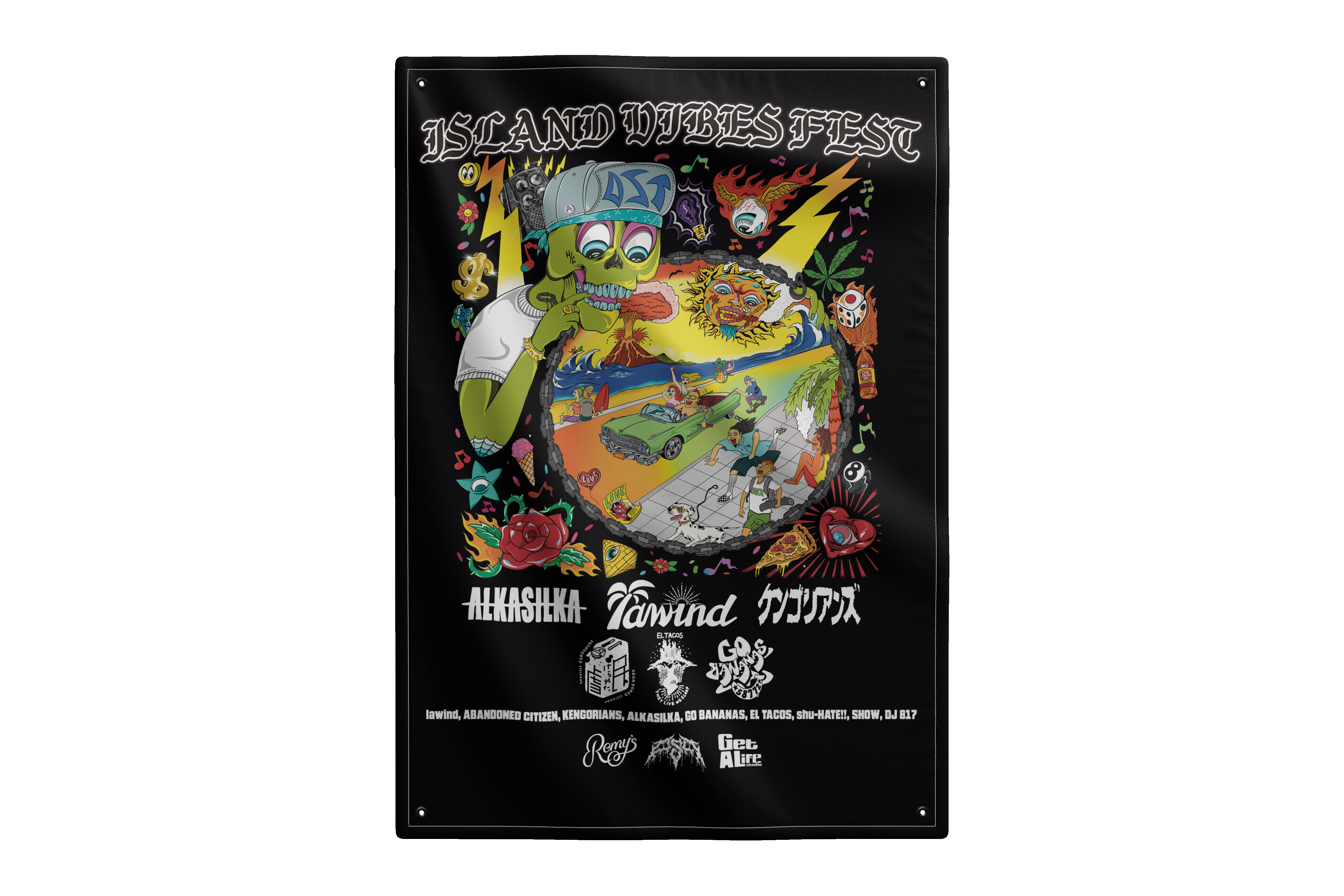 Island Vibes Fest flag with guest bands lawind from Tokyo.